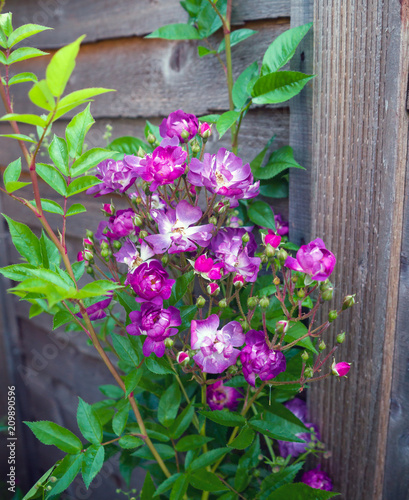 © Maksims, Fototapeta premium Flowering Purple White English Rosa Veilchenblau Climbing Rose Bush