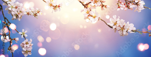 © Jukov studio, Fototapeta premium Flowering Spring, sakura blossoming branches on blue sky background with bokeh, light. Happy Easter holiday, top view, banner