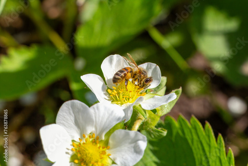 © Vitalii M, Obraz premium Flowering strawberry bush with a bee in the garden.