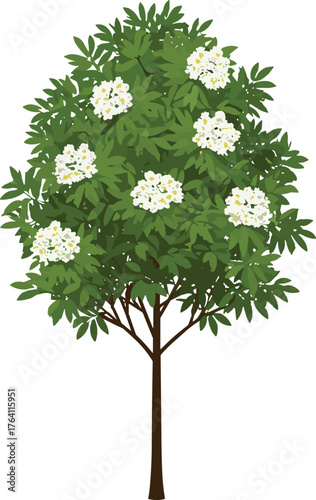 Fototapeta premium Flowering tree illustration with green leaves, white blossoms, yellow...