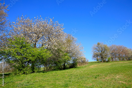 © Swetlana Wall, Obraz premium Flowering trees on meadow and blue sky.