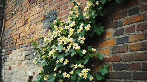 Naklejka premium Flowering Vine Against Weathered Brick Wall Showing a Beautiful Contrast of Nature and Manmade Structure