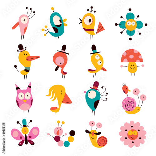 Fototapeta premium flowers, birds, mushrooms & snails characters set