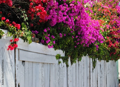 © michaelyn, Fototapeta premium Flowers Bursting over Wooden Fence1222-112014