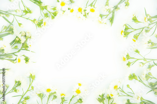 © Saichol, Obraz premium Flowers composition. Border made of daisy white flowers. Flat lay, top view