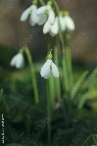 Fototapeta premium flowers first spring snowdrops. natural dark garden background.