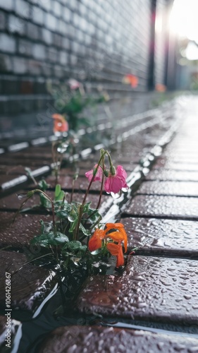 Naklejka premium Flowers growing in cracks of brick sidewalk, rain puddles and wet reflections