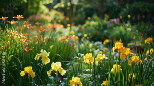 Obraz premium Flowers in a garden with yellow irises charming spring backdrop
