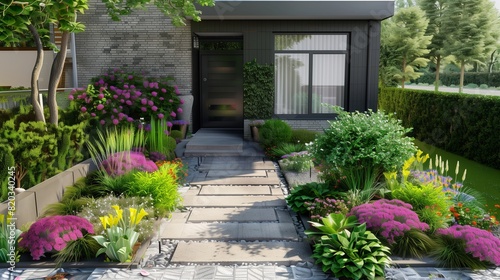 Naklejka premium flowers in front of a house,Design a garden next to the house