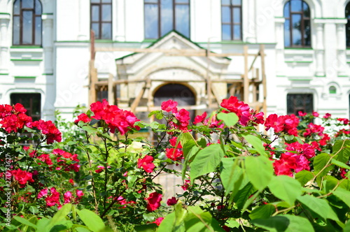© Olena Bandurka, Naklejka premium flowers in front of an old house