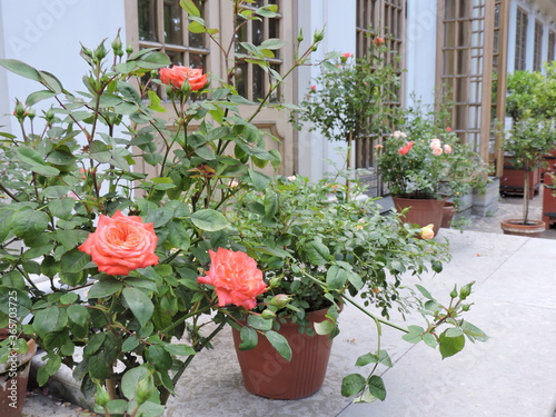 Naklejka premium flowers in pots in summer garden, Saint-Petersburg