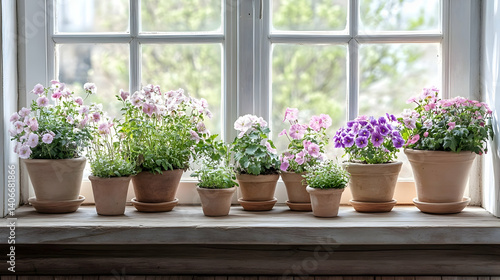 © laris manis, Obraz premium Flowers in Pots on a Windowsill
