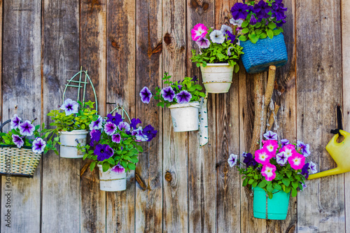 © Anatoly, Fototapeta premium Flowers in pots on the wooden wall
