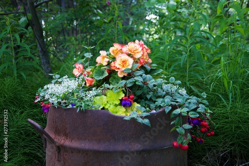 Fototapeta premium flowers in rusted metal barrel