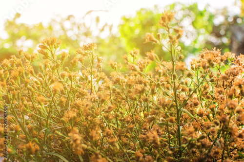 © Surasak, Obraz premium Flowers in the meadow and beautiful orange light.