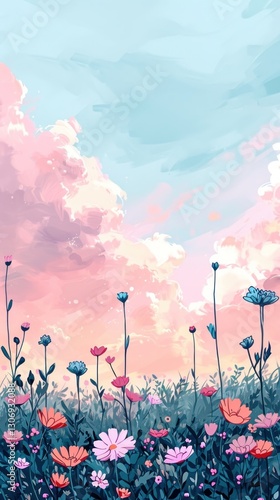 Fototapeta premium Flowers meadow and pastel sky backgrounds outdoors blossom.