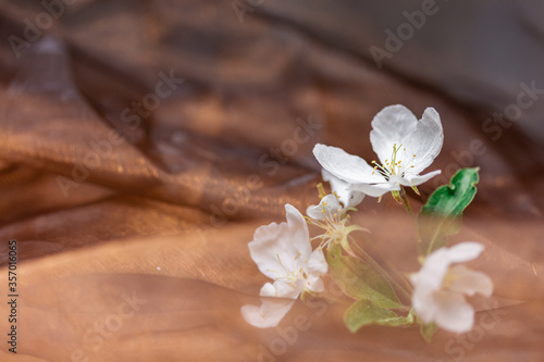 © M.V.schiuma, Fototapeta premium Flowers of apple tree, on a brown gas cloth. .Close-up. Concept: summer flowers