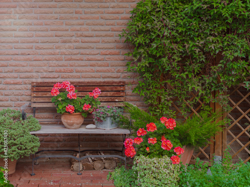 © Андрей Яровский, Naklejka premium flowers on a bench near the house