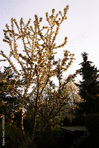 Fototapeta premium flowers on cherry branches at sunrise