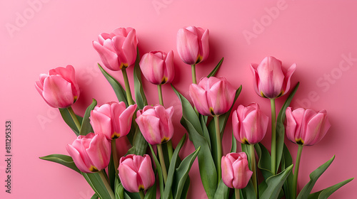 © naeem, Fototapeta premium Flowers pink composition. Flowers pink tulips on pastel pink background. Wedding. Birthday. Happy womens day. Mothers Day. Valentine's Day. Flat lay, top view, copy space