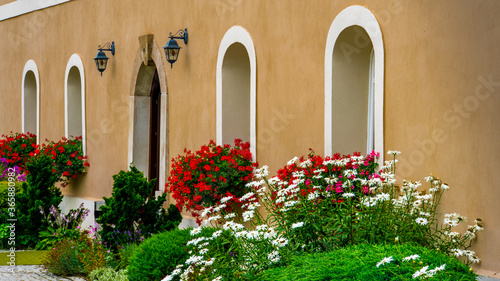 © RITHOR, Naklejka premium Flowers planted next to old buildings