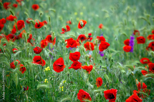 Obraz premium Flowers Red poppies bloom in a wild fields. Beautiful red poppies with...