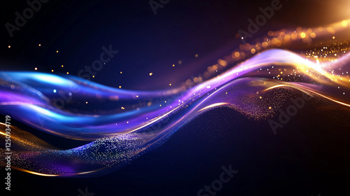 Fototapeta premium Flowing abstract blue and purple waves with gold accents, bathed in neon...