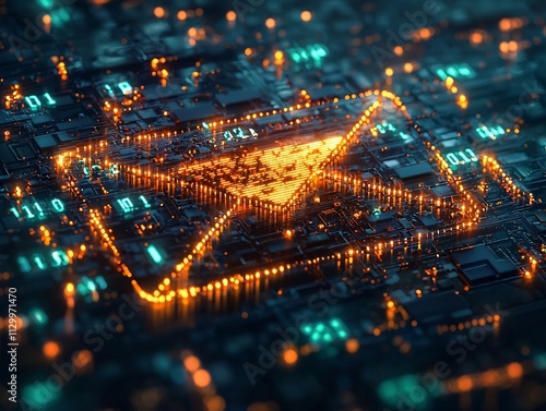 Fototapeta premium Flowing Binary Code Email Icon Against Dark Neon Lit Background