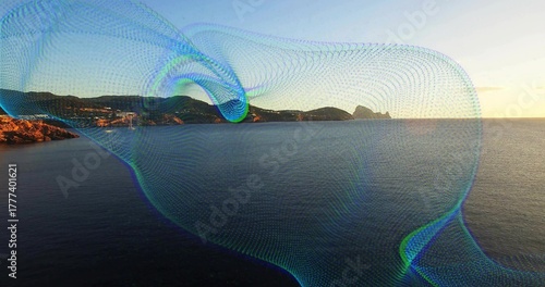 Obraz premium Flowing digital mesh wave overlay sweeping across seaside at sunset with rocky coastline and hills