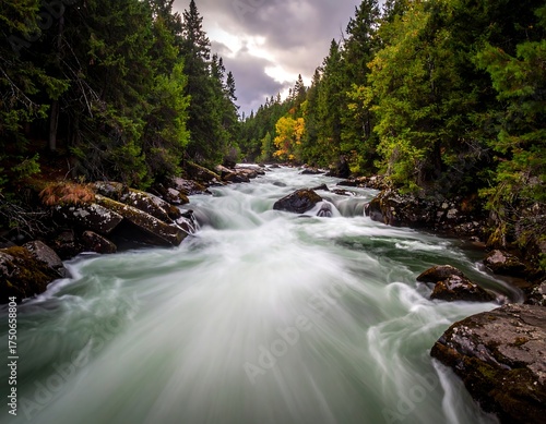 © Cah, Obraz premium Flowing river captured in a lush forest setting