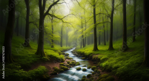 Naklejka premium Flowing River Stream in the Spring, mature trees and water, vibrant colors,...