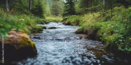 © Andrii , Obraz premium Flowing river stream with vibrant forest backdrop