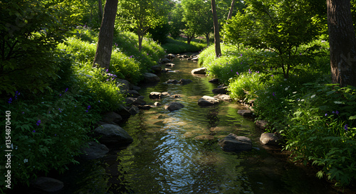 © Rita, Fototapeta premium Flowing Stream Through Lush Green Forest with Sunlight Reflections