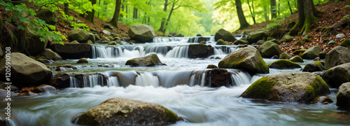 Fototapeta premium Flowing stream with smooth rocks in a lush green forest
