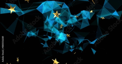 Fototapeta premium Flowing translucent blue polygonal mesh forming 3D ribbon in black void, with golden stars
