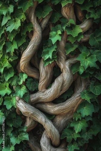 Naklejka premium Flowing vines entwined with lush green foliage create a vivid display of organic shapes in a thriving natural setting