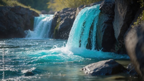 © Lasvu, Naklejka premium Flowing water and waterfall in a river or stream. Natural landscape, water, and rocks. Scenic environment with cascading water.