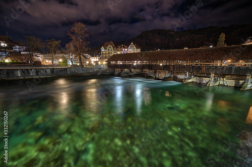 © Chris, Naklejka premium Flowing water under bridge during overcast night