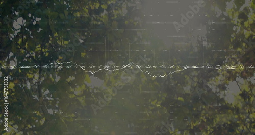 © vectorfusionart, Fototapeta premium Flowing white dotted waveform graphic across forest canopy, with sunlit tree branches and leaves