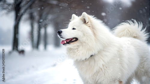 Naklejka premium Fluff and Frost Samoyed's Snowy Adventure JPEG file download