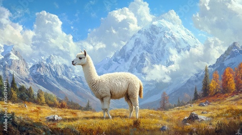 Naklejka premium Fluffy alpaca grazing in a serene field with a mountain backdrop, under a beautiful blue sky, creating a peaceful scene