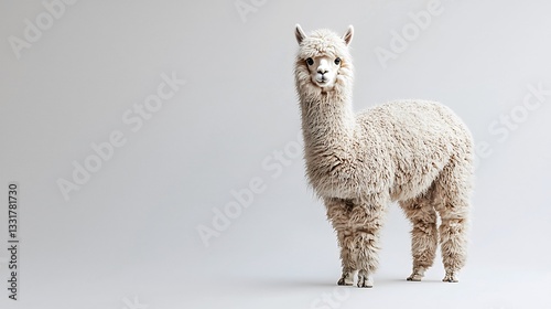 Fototapeta premium Fluffy alpaca posing elegantly against a pure white background in a studio environment
