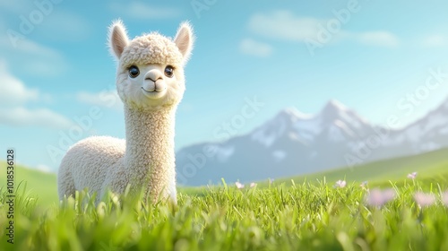 Fototapeta premium Fluffy alpaca standing in a vibrant green meadow, mountains in the background under a clear blue sky