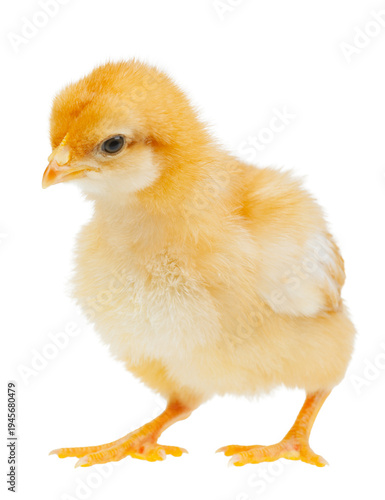 Fototapeta premium Fluffy baby chick standing isolated on white background
