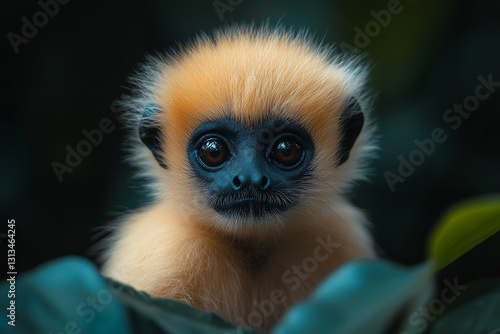 © MastersedZ, Obraz premium Fluffy baby monkey with striking blue face and large eyes in foliage