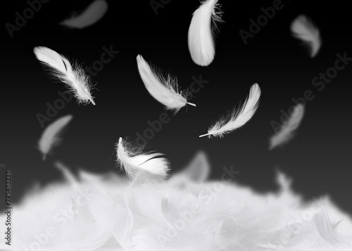 © New Africa, Obraz premium Fluffy bird feathers falling on black background
