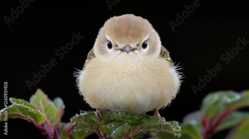 © tugkiara, Obraz premium Fluffy bird perched on leaves, dark background, nature closeup