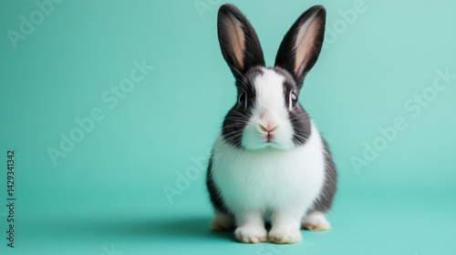 © Aisha, Obraz premium Fluffy black-and-white bunny, calmly sitting on a pastel green minimalist backdrop