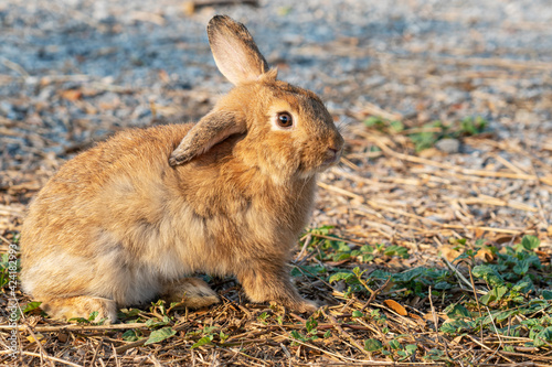 Fototapeta premium Fluffy brown bunny rabbit sitting on the dry grass over environment natural...