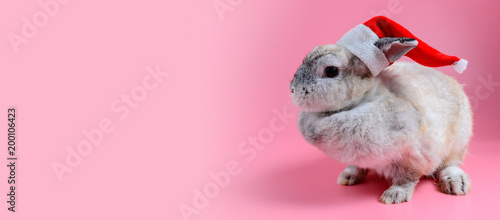 Obraz premium fluffy brown bunny wear santa claus hat sit on clean pink background, little...